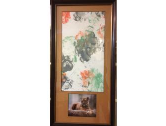 Tanvir, Malayan Tiger, is the perfect example of majesty. He poses regally for the picture that accompanies this fabulous orange, green and gray masterpiece! The tempera paint is on a white textured paper background. Fast Frames has donated the professionally cut terra cotta-colored matte with a black bevel. Fast Frames also donated the gorgeous dark brown with gold accents frame. Dimensions: 43" x 21".