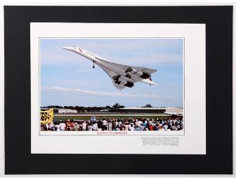Vintage 1985 EAA's AirVenture Oshkosh poster featuring the renowned Concord hovering feet above the runway.