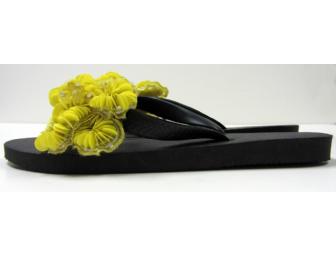 This motif on this sandal is embroidered with large white clustered sequins, trimmed with small crystals and with five pear cut crystals at the center. A yellow felt fabric is attached at the back of the motif as a base. A bright motif on black sandals gives a feminine yet edgy vibe.