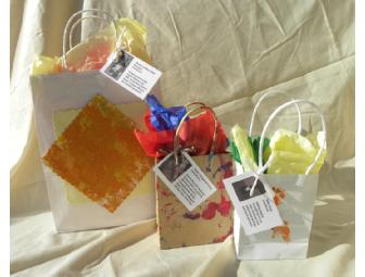 We have combined a variety of Knoxville Zoo's resident stars in this collection of beautiful and unique gift bags. "Mondo", Southern White Rhinoceros, created a medium-sized bag, while "Stella" Skunk and "Barley" Narragansett Turkey, have created two small-sized bags. The bags include tissue paper and a tag describing the artists. Medium Bag Dimensions: 10 1/2" x 8". Small Bag Dimensions: 4 1/2" x 5 1/2".