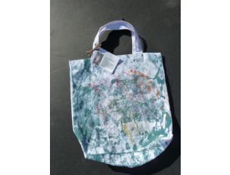This unique tote bag was decorated by "Mondo" Southern White Rhinoceros. It features green, orange, red, and yellow paint on both sides of the medium, white-colored tote bag. Dimensions: 13" x 12 1/2".