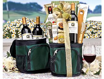 This golf bag cooler is hand-packed with a Wine Country exclusive Windwhistle Vintners cabernet sauvignon with flavors of vanilla spice and mocha, nestled alongside rosemary & olive oil naked herb crackers, brie cheese spread, chocolate hazelnut wafer cookies, dried fruit medley and Italian extra dark chocolate with hazelnut pralines.