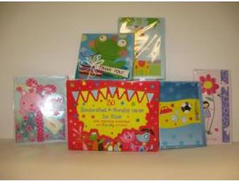A box set of 30 handrafted and novelty cards for kids with matching envelopes and stickers.