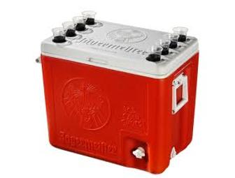 This cooler can hold up to six bottles of Jagermeister, lots of ice and still has room for some Red Bull. It runs on the same principal as the Jägermeister tap machine or any portable beer tap system.