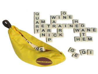 BANANAGRAMS® is the award-winning anagram game for ages 7+. BANANAGRAMS is for 1 – 8 players and needs no pencil, paper, or board. Fast and Fun! The banana-shaped pouch contains 144 tiles. Play at home, in restaurants, campgrounds, etc. Great for travel! BANANAGRAMS is also available in DOUBLE and SPANISH.