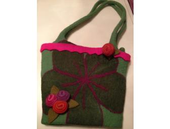 Never-used shades of green wool felt purse reminiscent of a flower pot; hot pink border and deep purple flower trim; zipper top closure and zipper pocket inside. 12"W x 10"H x 2"D; 11" drop shoulder strap.
