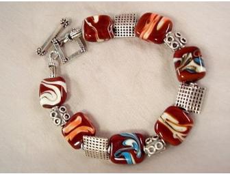 Shades of brown with turquoise, ivory and coral accents share space with square sterling silver beads.y An unusual look that is sure to start a conversation! This eye-catching artisan bracelet is 7 inches in length. The essence of Deb Rich's artistic expression is revealed in each lampwork bead that she creates in her studio. Deb's beads exhibit her desire to create and inspire change through community outreach. These jewelry pieces are offered exclusively through cMarket to support the fundraising efforts of non-profit organizations. Lampwork glass reflects both the heartfelt passion and interpretative expression of Deb Rich. Her artistic resume includes fantasy sculptures, creatively fashioned from found-objects and recycled materials. "The art of lampworking has a Zen effect," says Deb, "serving to calm and focus the artist and the viewer, enchanting both with the beauty of this molten solid." Indeed, Deb's Glass Designs are truly hypnotic, one-of-a-kind pieces that cannot be replicated or manufactured by a machine. Deb only sells jewelry pieces that capture the grace and flow of glass artistry. All jewelry is made with sterling silver or copper findings, Czech or Swarovski Crystals, and various complementary beads, making Deb's Glass Designs positively the best choice.