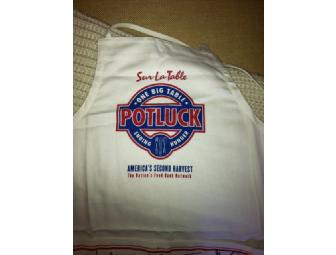 This apron is from the ONEBIGTABLE POTLUCK nationwide amateur cooking competition. It is signed by celebrity judges along with contestant finalists. Item includes a cookbook of the finalist recipes.