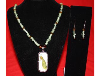 The set is a one-of-a-kind creation. The necklace has a cloisonné pendant with a peacock on it. The beads are light green and amber. The set comes with matching earrings.