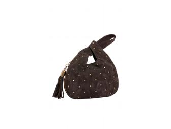 Gorgeous Milk Chocolate Suede Studded Handbag - perfect for evenings out this holiday season! Tassel detail, outside zipped pocket for keys, inside zipped pocket for valuables, as well as inside pockets for lip gloss, cell phone and business cards.