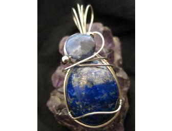 Natural lapis pendant, with lapis bead, wrapped in sterling silver. Pendant floats on a black silk cord and is 2 1/4" long.