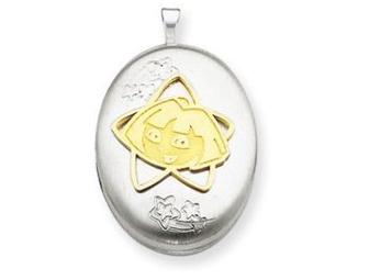 ADORABLE! Sterling Silver With 14k Dora 2-frame Oval Locket. Perfect gift for any girl! Sterling Silver With 14k Gold 5/8 Inch Wide Dora The Explorer 2-frame Oval Locket Average Load 3.39 Grams |