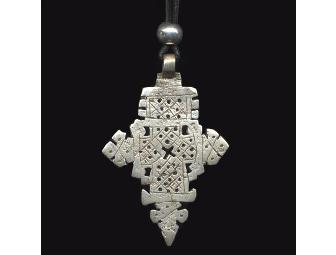 One-of-a-kind Ethiopian Silver Coptic pendant and Greek silver coated ceramic bead on adjustable leather cord.