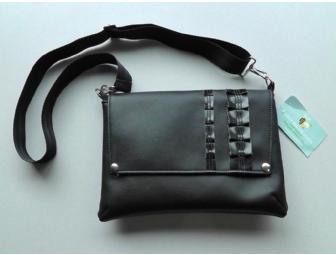 This vegan purse was made by Queen Bee Creations and donated by Absolutely Art. Queen Bee creates handmade, one-of-a-kind bags that are unique in style as well as materials. This purse is made from waterproof PVC-free faux leather which is durable and long-lasting.