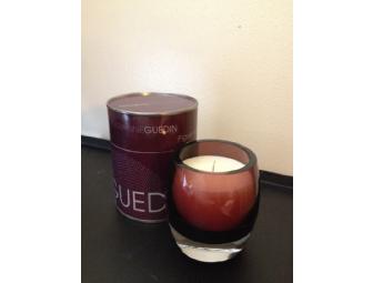 Luxury candle created by French designer Marianne Guedin who is known for her contemporary, organic design approach. The "Fresh Fig" scented candle is poured into a unique hand-blown amethyst glass container.
