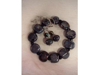 Our stretch bracelet with matching earrings creates an graceful jewelry pairing. This Japanese inspired method of firing??creates unpredictable patterns and spectacular metallic effects. The essence of Deb Rich's artistic expression is revealed in each lampwork bead that she creates in her studio. Deb's beads exhibit her desire to create and inspire change through community outreach. These jewelry pieces are offered exclusively through cMarket to support the fundraising efforts of non-profit organizations. Lampwork glass reflects both the heartfelt passion and interpretative expression of Deb Rich. Her artistic resume includes fantasy sculptures, creatively fashioned from found-objects and recycled materials. Deb's Glass Designs are truly hypnotic, one-of-a-kind pieces that cannot be replicated or manufactured by a machine. Deb only sells jewelry pieces that capture the grace and flow of glass artistry. All jewelry is made with sterling silver or copper findings, Czech or Swarovski Crystals, and various complementary beads, making Deb's Glass Designs positively the best choice.