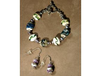 Swirls of blue, green, purple and ivory blend together to create the colors of a stormy surf. Clear crystals and colored beads add beauty to this 7 inch long bracelet. Matching earrings are included with this breathtaking jewelry set. The essence of Deb Rich's artistic expression is revealed in each lampwork bead that she creates in her studio. Deb's beads exhibit her desire to create and inspire change through community outreach. These jewelry pieces are offered exclusively through cMarket to support the fundraising efforts of non-profit organizations. Lampwork glass reflects both the heartfelt passion and interpretative expression of Deb Rich. Her artistic resume includes fantasy sculptures, creatively fashioned from found-objects and recycled materials. Deb's Glass Designs are truly hypnotic, one-of-a-kind pieces that cannot be replicated or manufactured by a machine. Deb only sells jewelry pieces that capture the grace and flow of glass artistry. All jewelry is made with sterling silver or copper findings, Czech or Swarovski Crystals, and various complementary beads, making Deb's Glass Designs positively the best choice.