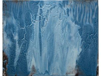 Artist's Statement: I am influenced by natural forces and often make references to the motion of the planets and other celestial bodies in my work. At the time of this painting "Dark Moon," I had observed a "super moon" one evening. The moon appeared to have a reddish cast and was obscured by clouds. The other force acting in my work is gravity. While painting, I actively employ the pull of gravity in conjunction with my bodily force and gesture to create the shapes and veils of paint on the canvas. Painting in this manner allows me to feel a certain connection to nature in a general and also the limitation of the materials in play.