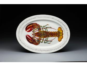 This 15" x 11" inch serving platter is made of Czech porcelain, fired in the U.K., and features artwork by noted artist Richard Bramble. The text on the platter reads "'Homarus americanus' Lobster is a crustacean of the primitive order of decapods living on rocky sea beds. Found on the Atlantic coast of North America they are caught with baited traps. Olive green to reddish brown, varying according to habitat, they turn red when cooked."