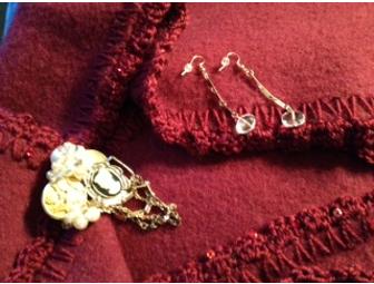 Unused vintage Faribault Wool blanket re-created into a burgundy merino wool wrap with hand edged burgundy sequin trim accompanied with one-of-a kind broach created with WWII buttons, vintage cameo and pearls then paired with one-of-a- kind vintage gold chain crystal earrings to wear for the holidays or any event to impress!