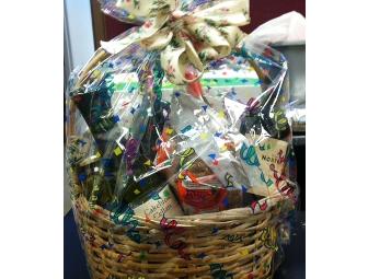 This basket is a great gift for the holidays! It includes: five bottles of assorted wines along with olives, chocolates, pretzels and decorative napkins.
