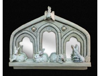 Handmade mixed media piece with showing bunnies at play and rest. Vintage angel bunny with wings and ice blue rhinestone accents add playful touch.