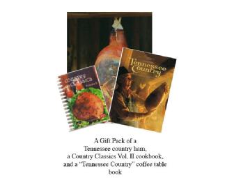 A genuine Tennessee Country Ham, along with a Country Classics II cookbook and a "Tennessee Country: In the land of their fathers" coffee table book.