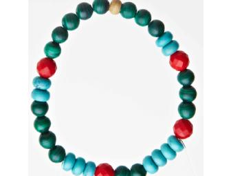 Malachite, turquoise, coral and Haitian wood bead on elastic cord. One size fits most.