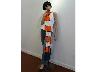 Crocheted 100% acrylic so it doesn't itch! I think it's about 10 feet long! It has orange in it!
