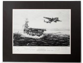 Professionally matted and signed by 17 of the Doolitle Raiders. Depicts departure of the B-25 from the deck of USS Hornet. Artist is Robert Bailey. Accompanying the print is an authentic sheet of official letterhead and original signatures of 18 of the Doolittle Raiders.