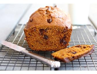 Two loaves of freshly baked pumpkin chocolate bread in a 8"x4" holiday baking foil. One to keep and one to share!