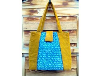 The outside is mustard colored corduroy, with blue thread that shows in the channels. The central panel is dupioni silk and has texture. Lining is first quality cotton in matching color and has 5 inner pockets. It is padded. The base is hard, so the bag keeps its shape even when it is fully loaded. Handles are made of padded corduroy and are very strong.