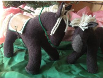 Hand sewn from upcycled felted wool & cashmere. The saddle is leather.