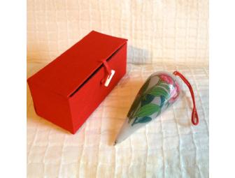 Hand-blown, tear-drop glass ornament delicately painted with pink and magenta flowers. Quite sturdy with red satin rope.