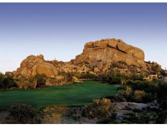 Escape to a secluded haven amid the natural splendor of painted desert sand, towering cacti, and clear, blue sky - The Boulders. This luxury retreat truly inhabits a unique location from other exclusive Scottsdale resorts. Nestled in the Sonoran Desert - just outside Scottsdale, Arizona - The Boulders provides unsurpassable recreation elegantly combined with robust indulgence, flawless service, and breathtaking setting. Restore your body and mind with a massage for two at the award-winning, world-renowned Golden Door Spa OR enjoy a round of golf with a choice of two Jay Morrish designed championship courses. Discover a warm sense of renewal in a peaceful, stirring atmosphere within the stunning North Scottsdale hotel and resort. This package also included roundtrip coach airfare vouchers for two on American Airlines. Blackout dates will apply. Valid one year from date of purchase. A 60 day pre-booking notice is required and is based on availability.