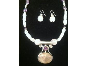 A stunning rose quartz, amethyst and sterling silver pendant on matching amethyst, sterling and rise quartz necklace with sterling Bali rope toggle. The necklace is 18" in length. The matching rose quartz earrings are in silver tone. A beautiful pairing.