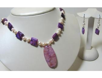 This necklace and earring set of beatiful purple stone and pearls is versatile - it can be worn with jeans and a casual top, or with a dress for date night.