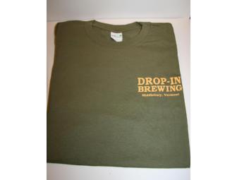 This item is a 100% Organic Cotton Olive Green T-Shirt, size Large donated by Drop-In Brewing of Middlebury, Vermont. Visit them on Facebook: https://www.facebook.com/dropinbrewing