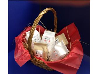 Basket of mixes from Apple Hill Farm Concord, New Hampshire, includes Buttermilk Pancake Mix, Blueberry Pancake Mix, Apple Pancake Mix, Whole Wheat Pancake Mix, and Maple Coffee Cake Mix.