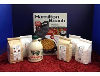 Breakfast from New Hampshire - Includes Waffle Maker, NH Maple Syrup and variety of mixes from Apple Hill Farm, Concord NH - Buttermilk Pancake Mix, Blueberry Pancake Mix, Apple Pancake Mix, Whole Wheat Pancake Mix, and Maple Coffee Cake Mix.