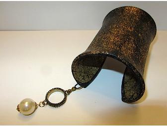 4" Metal cuff covered in black leather with a gold dust print, and antic brass charm ring with pearl. Imitation pearl, lined in black and gold contrast printed leather.