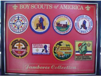 This vintage Jamboree patch set is mounted with tape so patches can be removed at buyers discretion. Patches are in excellent condition. There is no plastic or glass covering though all are framed. Frame is approximately 15" x 12".