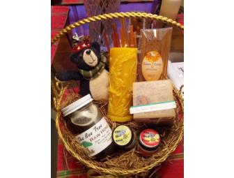 A basket of Bee Tree products from southwestern Colorado. Includes a jar of raw honey, a beeswax candle, a lotion bar, calendula salve (used for healing and dry skin), arnica salve (used to sooth sore muscles), a variety of flavors of honey sticks and a cute stuffed bear.