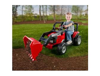 Case IH Tractor with Loader - 12 volt batter-operated ride-on. Two speeds, plus reverse. Working manual front loader. Adjustable bucket seat. Weight capacity: 85 lbs.