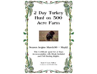 2-Day Turkey Hunt with full accommodations and meals included on 500 Acre Farm located in Houston County. Farm belongs to the Houston County Farm Bureau Board President, Ralph Sullivan and his wife, Laura. Tennessee Turkey Hunts begin March 30th through May 12th 2013. To schedule hunt, please contact Ralph or Laura at 931-289-3394 or call the Houston County Farm Bureau Office at 931-289-4171.