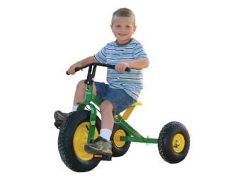 Adjustable seat. Large pneumatic tires with thick tread. Age: 3 years and up. Made from steel. Dimensions 27.5 in. L x 23.75 in. W x 7.25 in. H (30.07 lbs.) Your yards and driveways are no match for this rugged three-wheeler. Kids will grow out of it before they grow tired of it! Built John Deere tough!