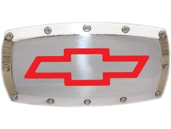 Chevrolet red Bowtie bolted & polished hitch cover. Constructed from 6061 T6 billet aluminum with CNC machine faceplates that are expertly welded, these premium parts are extremely strong with long lasting durability. Each hitch cover is powder coated for beauty and corrosion resistance. Hitch cover will fit receivers of 2 inches. Computer engraved with fine details and filled with bold colors. Billet is highly polished to a brilliant shine. Perfect for use with your Chevy!