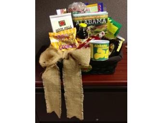 Basket of Alabama produced foods with a Farming Feeds Alabama Cookbook (http://farmingfeedsalabama.com/) produced by the Alabama Farmers Federation. Foods include Bud's Best Cookies, Alabama Roasted Peanuts, Red Diamond Tea, AlaGa Syrup, Honey, Mooks Mills Cheese Straws, and Alabama grown pecans. Also includes a Farming Feeds Alabama Apron.
