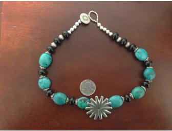 A delightful play on our Western culture is displayed in this necklace featuring turquoise colored stones and a silver spur rowel. The striking combination of silver and black turns this 25 inch strand with a toggle closure from an accessory into a conversation piece.