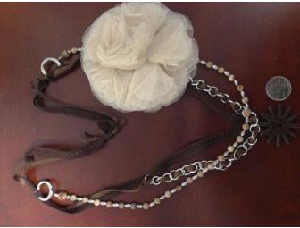 Elegant ribbons and a rustic spur rowel come together in this whimsical necklace. The 30 inch length makes it easy to slip over your head and the neutral colors make it easy to coordinate with anything. Adding a touch of female sensibilities, the fabric flourish can be removed when desired.